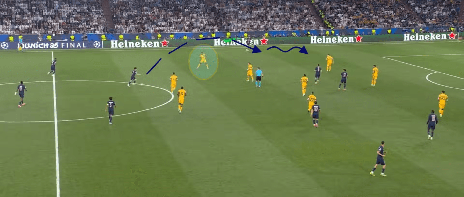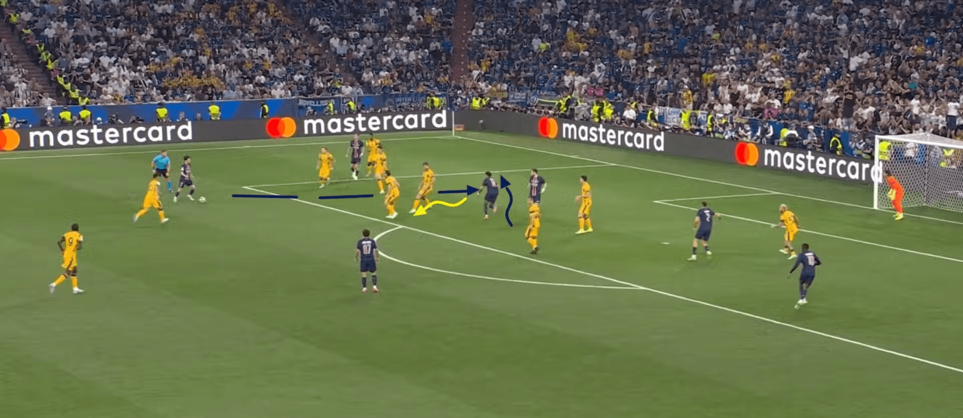 При развоя на ситуацията защитната линия на Интер остава напълно объркана от движенията на играчите на ПСЖ, като Ачерби опитва безразсъдно да вдигне линията, а Бастони не проследява пробива на Дуе зад гърба му. Почти излишно е да се подчертава как Витиня разчита всичко до съвършенство и подава хирургично за пробива на Дуе.