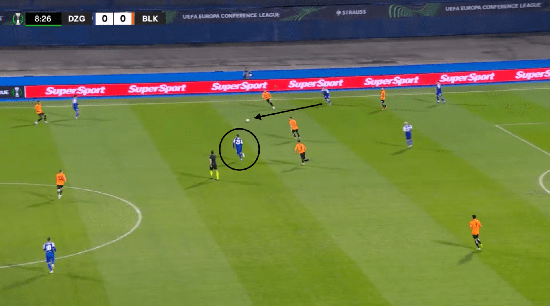 В мач от декември 2023 за Лига Европа срещу Балкани Сучич намира празното пространство (след като разчита движението на другия халф), за да получи топката в собствената половина и да я води със самочувствие.