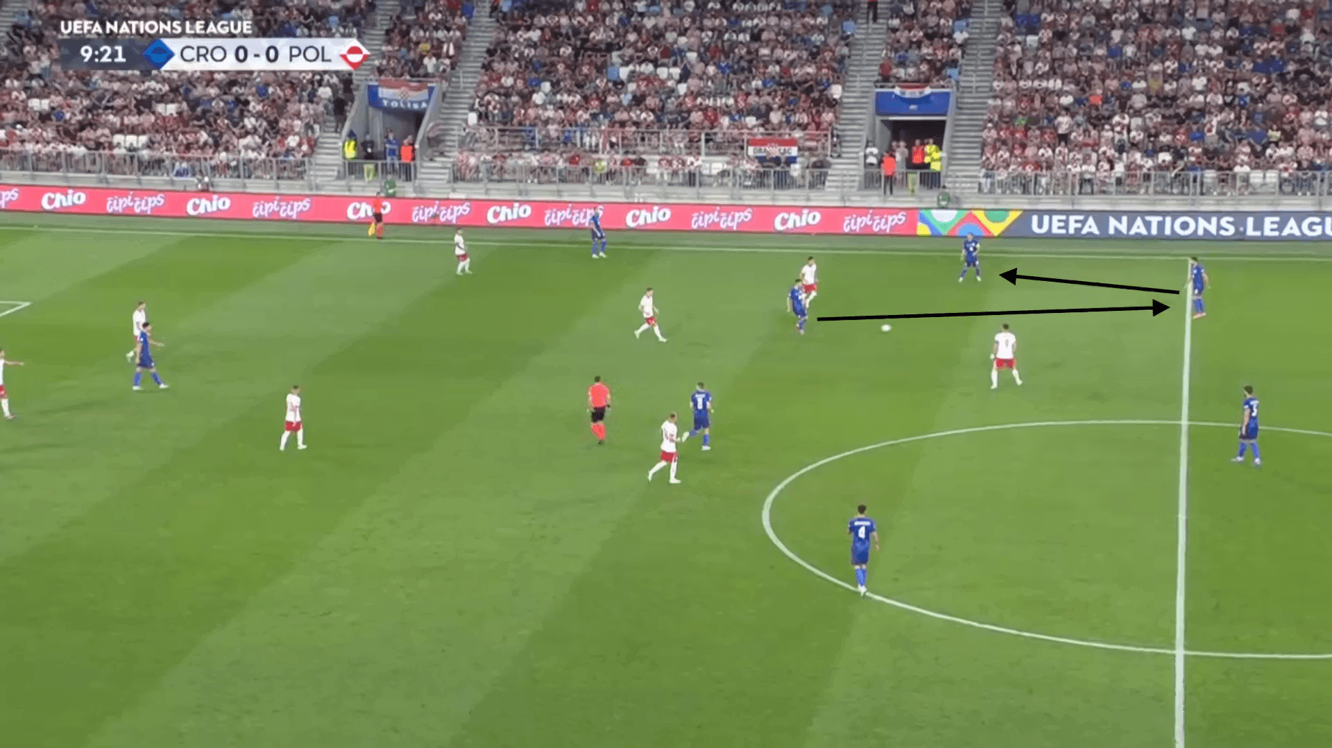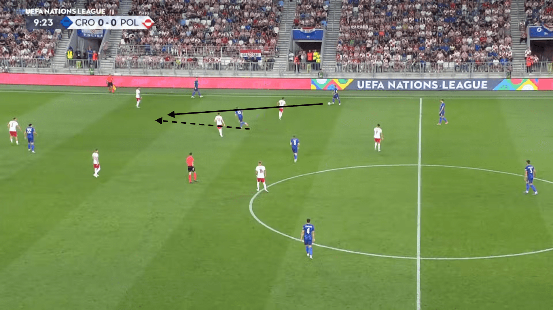 Никой не е по-прецизен от Модрич, когато трябва да получиш топката в полупространство. В мач от Лигата на Нациите тук движението на Сучич е консервативно, когато е с гръб към вратата, но когато топката се движи напред - намира нужните пространства и стига до чуждото наказателно поле.