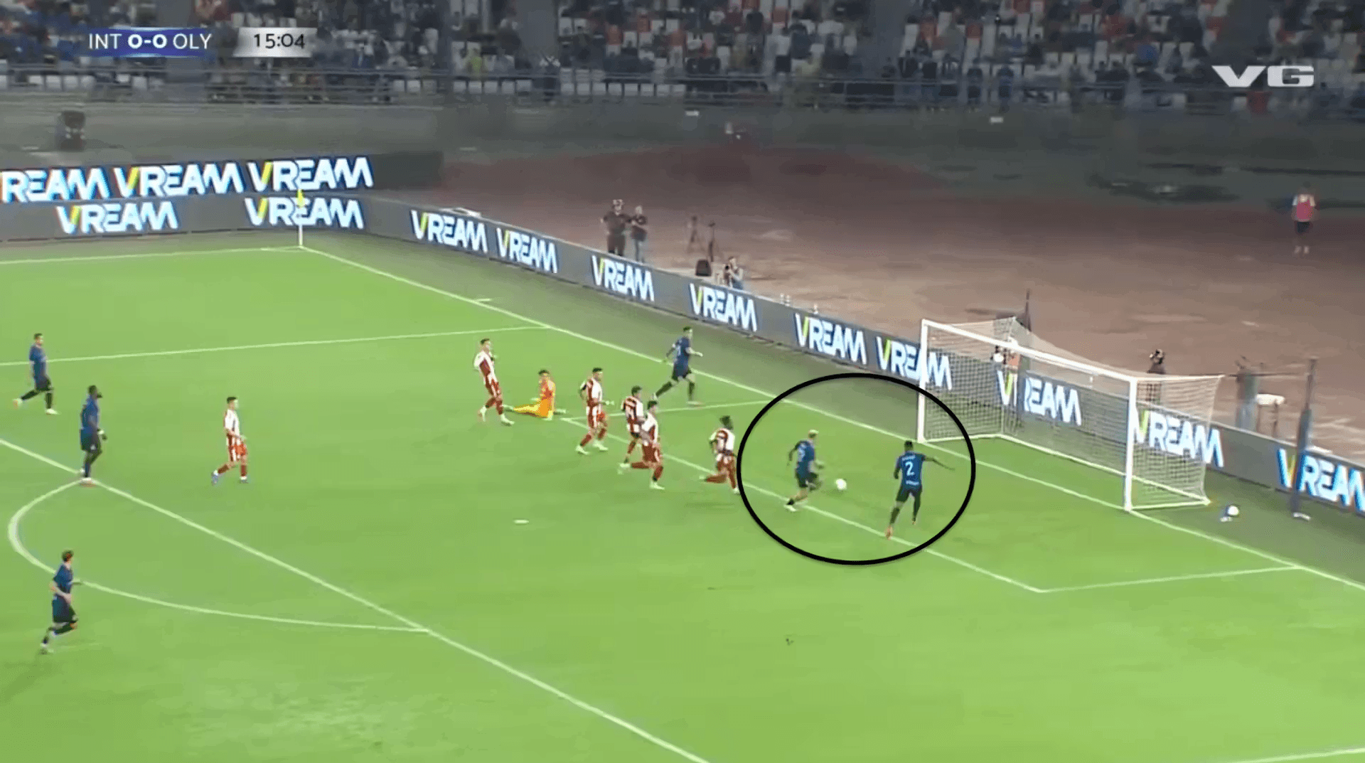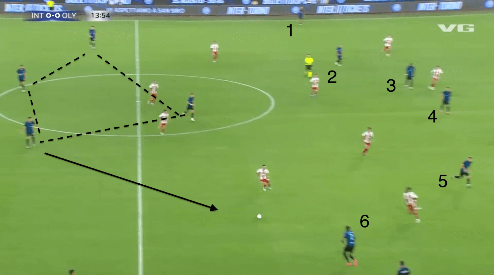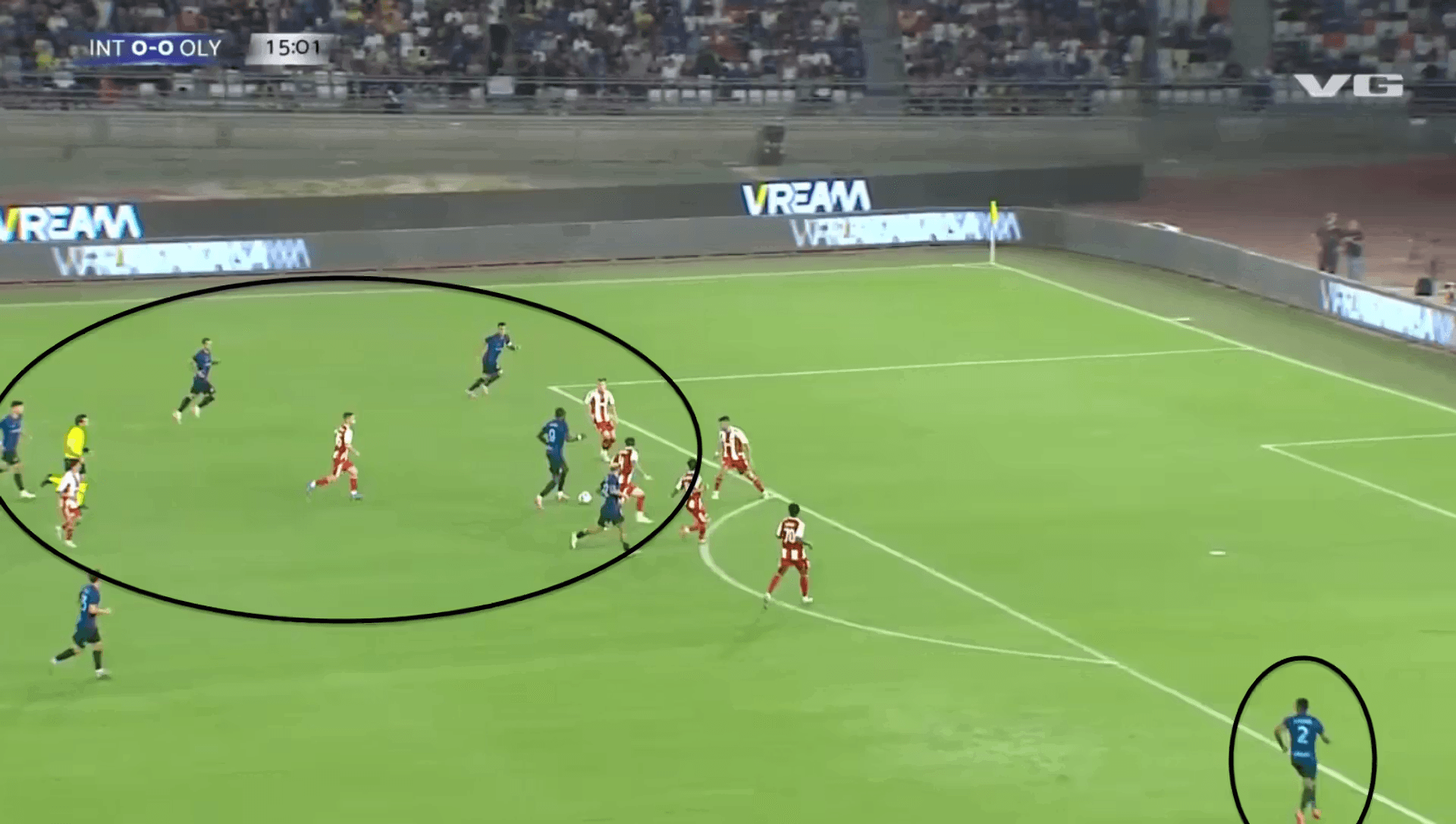 Най-доброто от тактическата зрялост на Интер: претоварване на единия фланг, индивидуалната класа на Тюрам отваря крилото и се атакува "сляпата" страна зад гърба на противника. Димарко завършва атаката пред другия халф-бек Дъмфрис като символ на гъвкавостта на тима в атака.