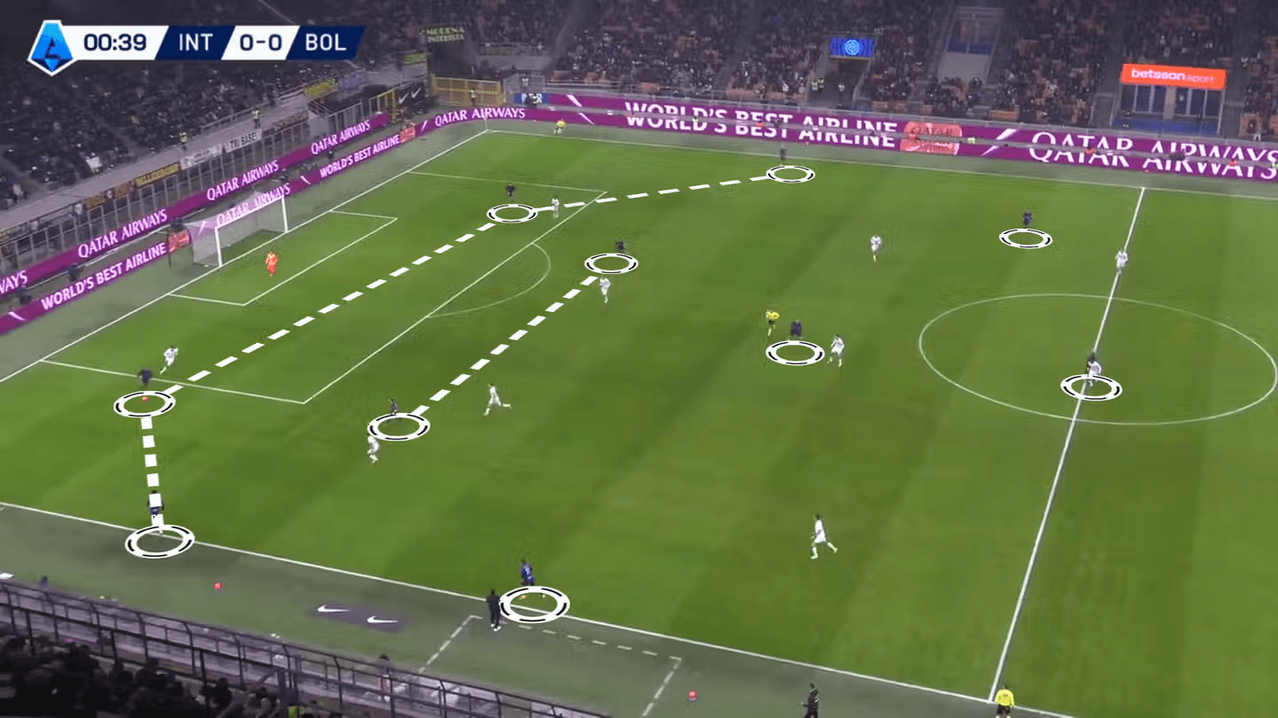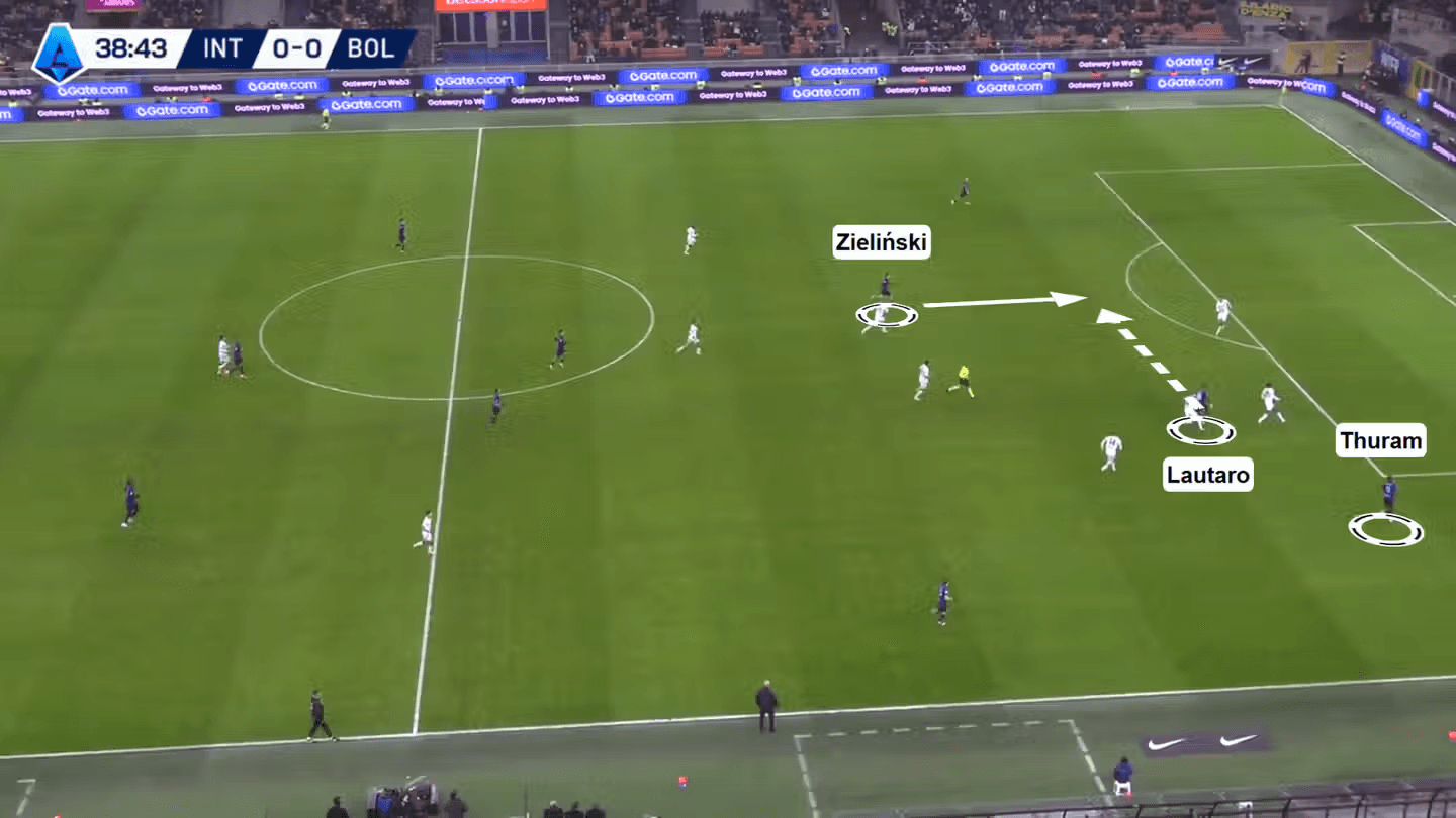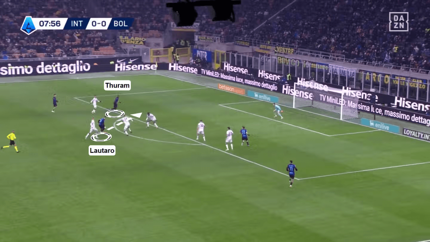 Не е случайно, че според данните на Football Reference двамата са имали индустриално количество докосвания до топката: 48 за Тюрам и 41 за Лаутаро. За сравнение, аржентинецът е разполагал със същия брой топки като халф като Николо Барела и с три повече от Пьотр Жиелински. Това постоянно търсене на комбинация в движенията и отиграванията на двата офанзивни ориентира, заедно с вече споменатите ротации и с винаги доброто изнасяне на топката, в крайна сметка обърка защитните механизми на Болоня.